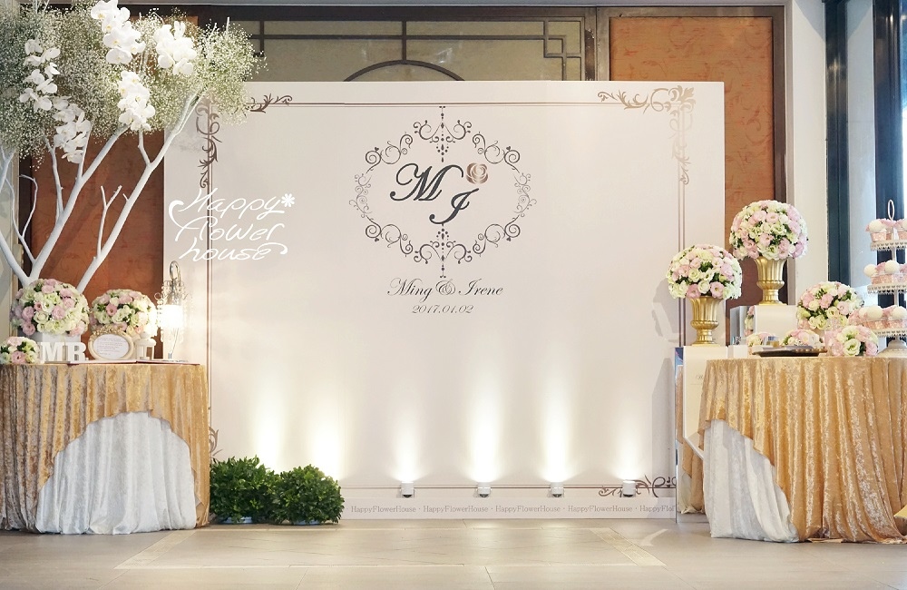 *~花居樂花坊~*1060102大溪 大溪山水庭園餐廳 Ming&Irene 白金色典雅主題背板設計 婚禮佈置